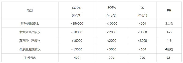 1、醇酸樹(shù)脂廢水:廢水中主要含有三苯、醇類,醚類、脂類,廢水的COD為130000-150000mg/L。
