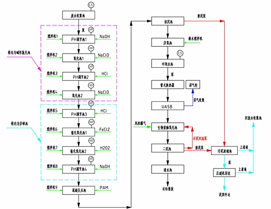 污水先PH調(diào)節(jié)池,然后在經(jīng)過氧化池,這樣來回的重復(fù)幾個(gè)流程,在進(jìn)入PAM反應(yīng)池,然后經(jīng)過沉淀,使排放出去的水能夠達(dá)標(biāo)。其具體的流程圖如下。